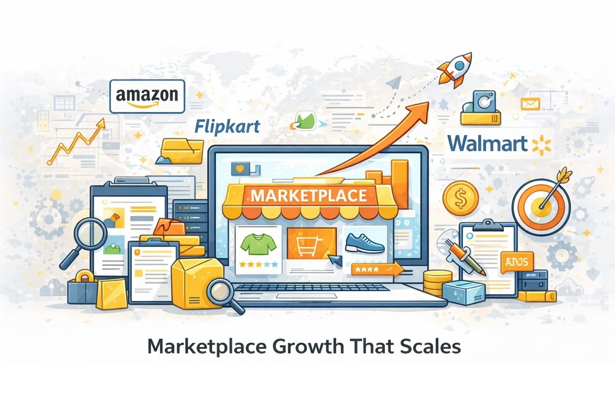 Marketplace growth helps brands scale online sales, expand multi-channel presence, and reach high-intent customers across leading platforms. With expert marketplace management, optimized product cataloging, and high-converting creatives, businesses improve search visibility, conversion rates, and ROAS. Strategic new marketplace expansion unlocks faster growth, wider reach, and sustainable eCommerce scalability.